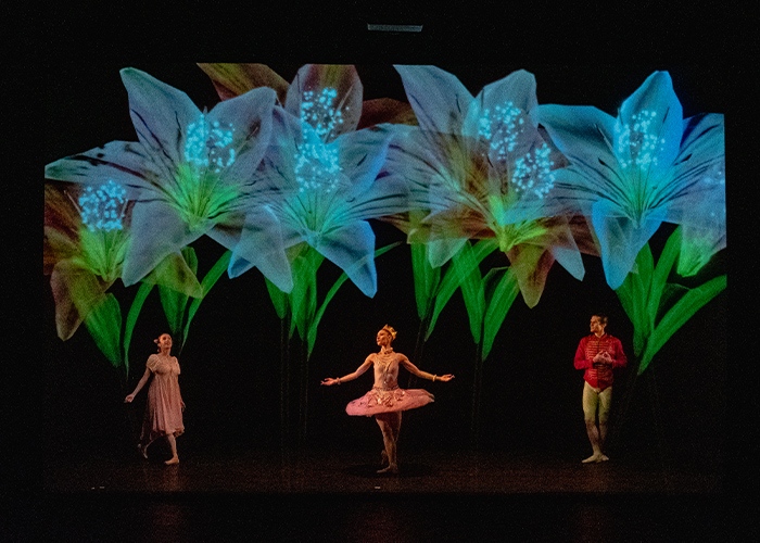 L’histoire de Casse-noisette à cheval sur le rêve et la réalité est alors sublimée. Les danseurs formés à l’Opéra de Paris interagissent avec les projections numériques d’objets et de personnages fantastiques issus du mythique ballet-féerie. La technologie sert la magie d’un monument musical et chorégraphique. La valse des flocons, la valse des fleurs, le pays des sucreries, les divertissements… le ballet de Casse-Noisette devient alors un terrain de jeu idéal à la créativité offert par le virtuel.