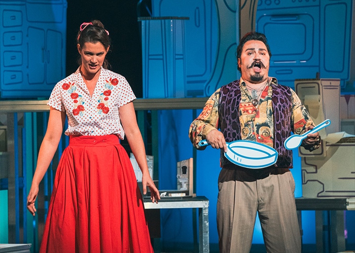 Pour rendre l’œuvre accessible et vivante, les dialogues sont en français, et les airs chantés en italien, transformant chaque réplique et chaque note en moteur du rire et de la surprise. La scénographie, inventive et dynamique, accompagne le flux de l’intrigue, faisant du décor un acteur à part entière.